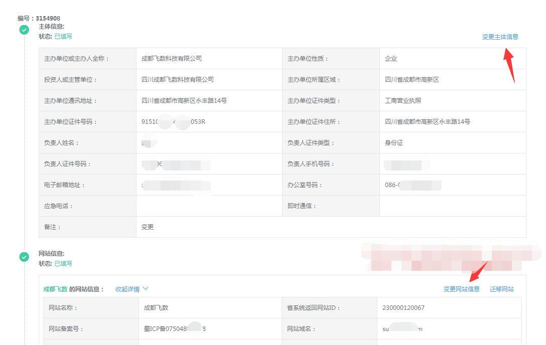 4、點(diǎn)擊主體信息變更,把信息修改為正確信息(如:公司名稱、證件號(hào)碼),負(fù)責(zé)人為法人信息。然后點(diǎn)返回。 必選:變更主體信息 和 變更網(wǎng)站信息。