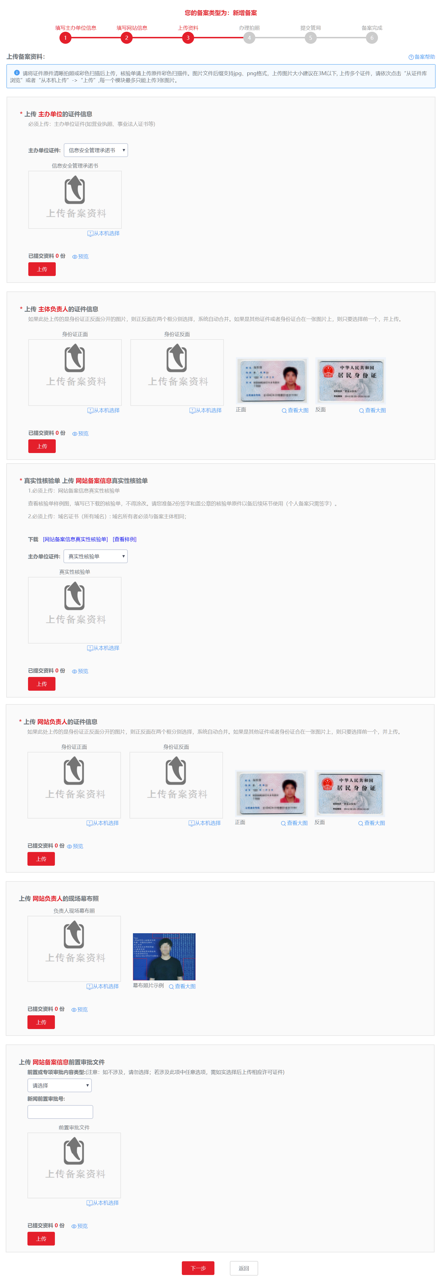4、上傳備案資料(請(qǐng)注意“ 必須上傳 ”項(xiàng),按提示指導(dǎo)上傳資料)。