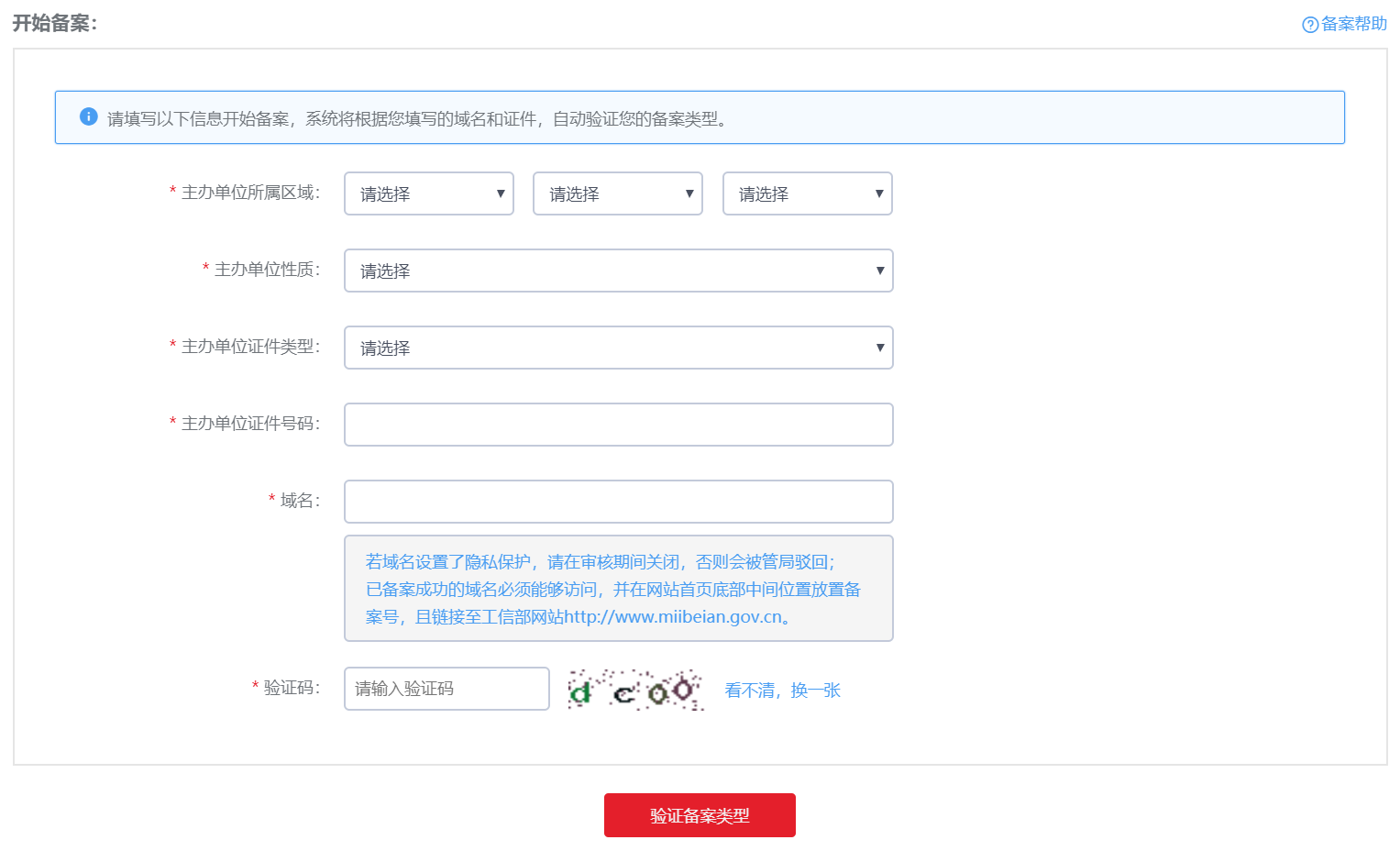 2、填寫您的主體信息及未備案的域名(用于建設(shè)新網(wǎng)站),然后單擊 驗(yàn)證備案類型。