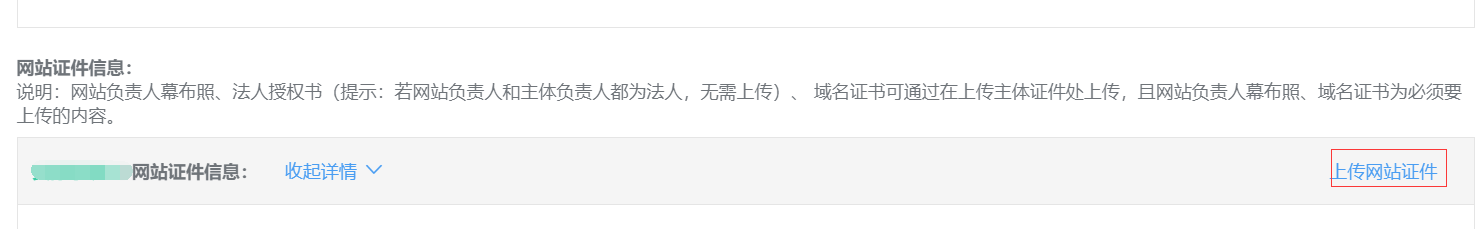 5、幕布照拍好后請進(jìn)入“查看備案信息”頁面,點(diǎn)擊“上傳網(wǎng)站證件”---上傳幕布照片
