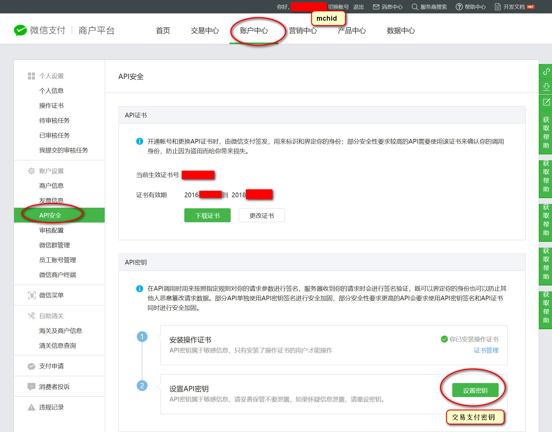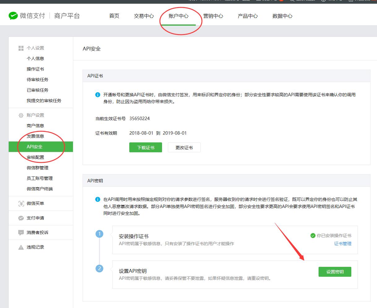 (5)KEY:登錄你的微信商戶平臺(tái) https://pay.weixin.qq.com/, 選擇[ 賬戶中心 ] - [ API安全 ] - [ 設(shè)置密鑰 ] 查看,如圖:
