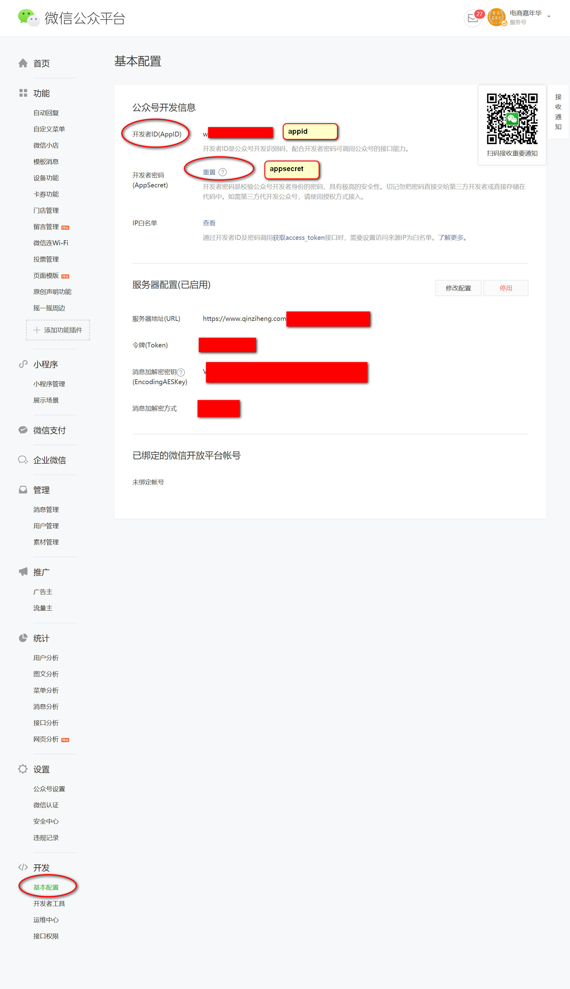 (3)APPID:登錄微信公眾號(hào)平臺(tái) https://mp.weixin.qq.com/,左側(cè)找到 [ 開發(fā) ] - 基本配置 - 在公眾號(hào)開放信息中可查看到開發(fā)者ID(AppID),如圖: